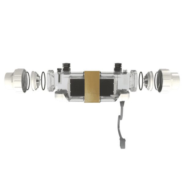 Electrolyseur au sel intelligent avec cellule transparente et régulateur de pH.
