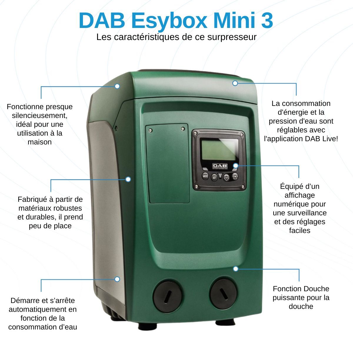 Découvrez l’Esybox Mini 3, la dernière innovation de la marque DAB, alliant performance, compacité et facilité d’utilisation. Conçu pour répondre à vos besoins en matière d’alimentation en eau, ce modèle plus léger et abordable conserve tous les avantages de sa grande sœur, l’Esybox, tout en offrant une installation simple et sans entretien une fois en place.